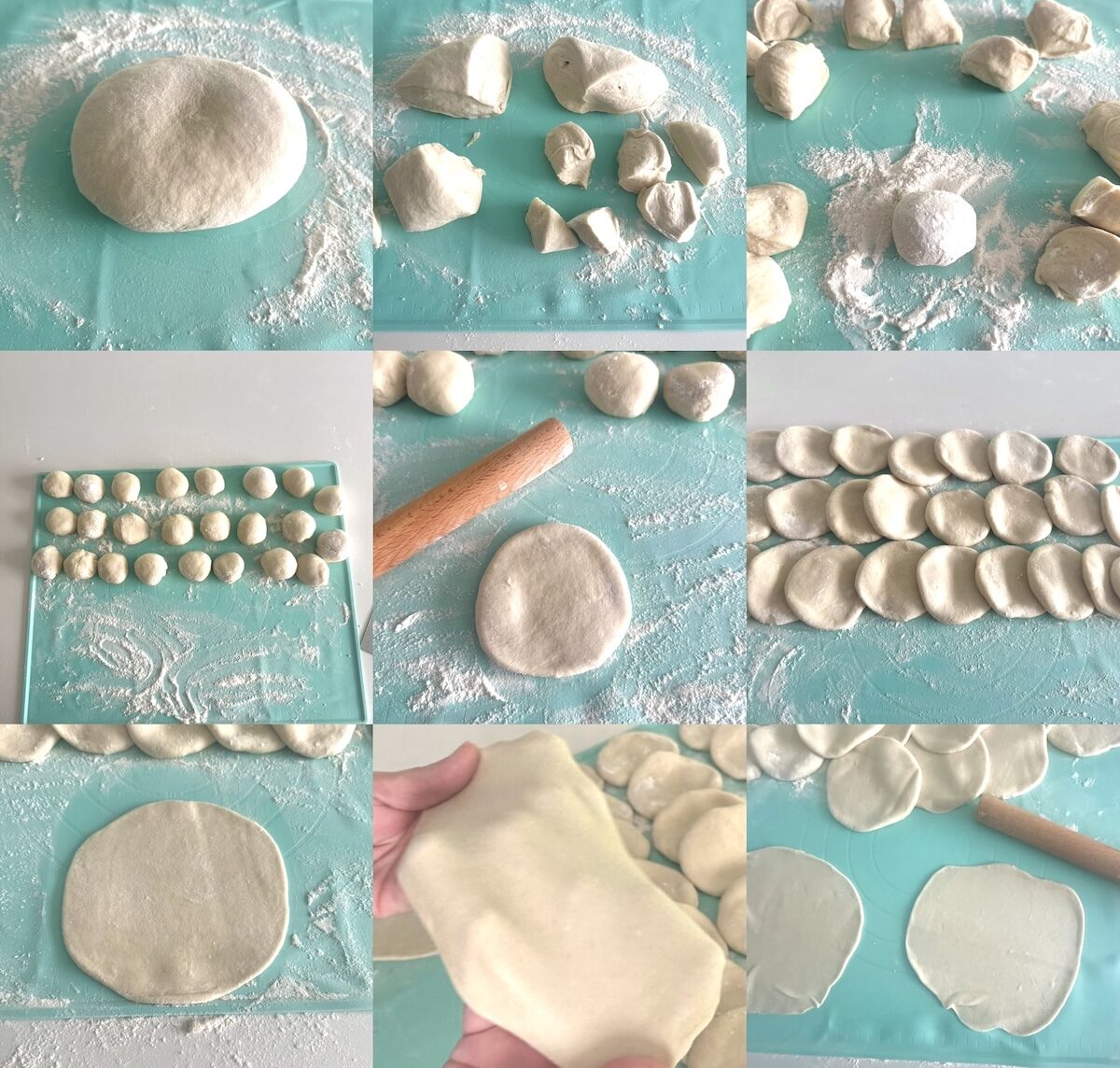 Tijesto podijelite na 4 jednaka dijela a zatim svaki dio na 6 i formirajte loptice. Svaku malo razvaljajte.