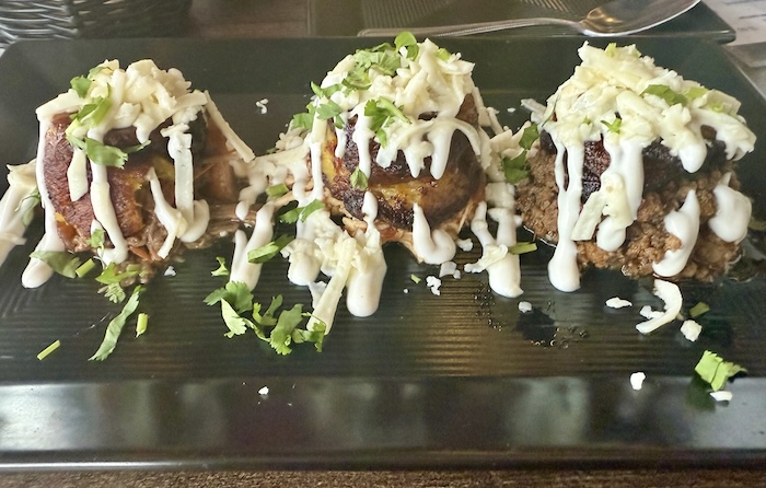 Plantains, chicken, picadillo, shredded beef, queso, cream, and cilantro make up this most intriguing version of plantains I’ve ever seen. All of these ingredients were not in each. Rather, each of 1 chicken, 1 picadillo, and 1 shredded beef is topped with queso, cream, and cilantro. You can see the shredded beef overflowing on the one to the far left.