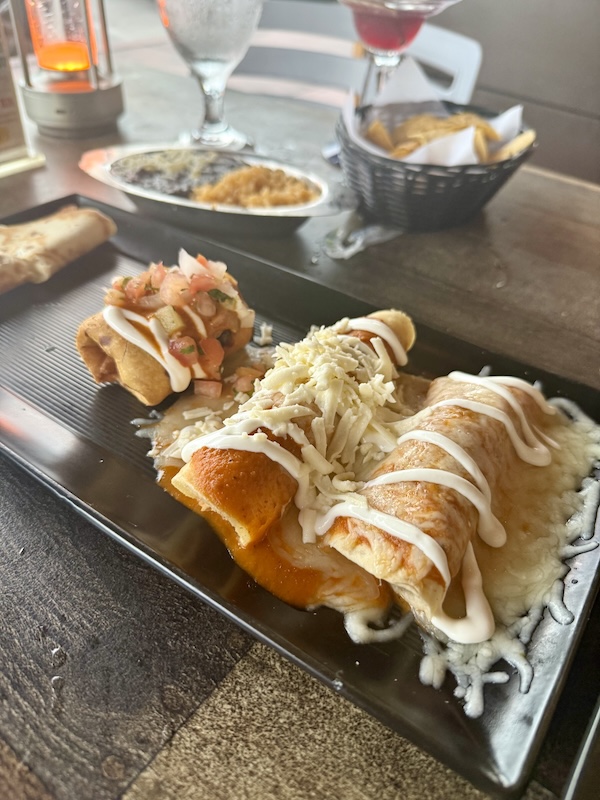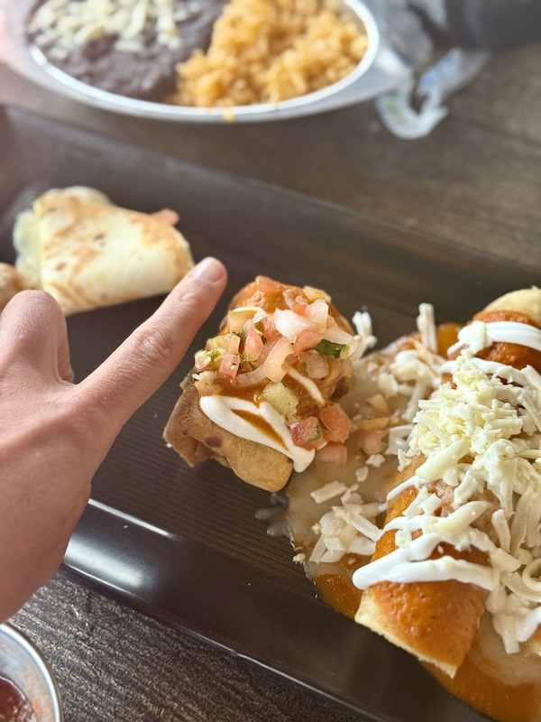 What arrived: The sauce leaned one-note, closer to a thin tomato gravy than a chile-forward enchilada rojo, with shredded cheese on top feeling like an afternote. Inside, the chicken inside was dry and a sharper chile blend and a lighter hand with dairy would restore definition.