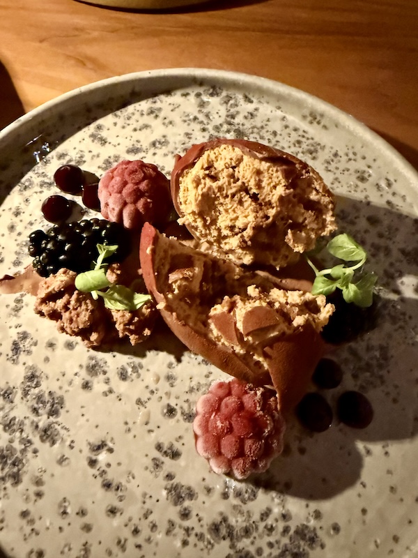 The Cocoa Pod is a showstopper and the dessert I prefer. While more familiar, it still is an innovative take on a chocolate dessert. The shell gives a clean snap, opening to a silky mousse that layers gianduja’s roasted hazelnut richness with the bright tang of passion fruit. The acidity from the passion fruit and blackberry cuts the chocolates sweetness and lets the nutty depth of the gianduja shine. Temperatures are spot on, with the mousse just cool enough to feel lush without dulling flavor.
