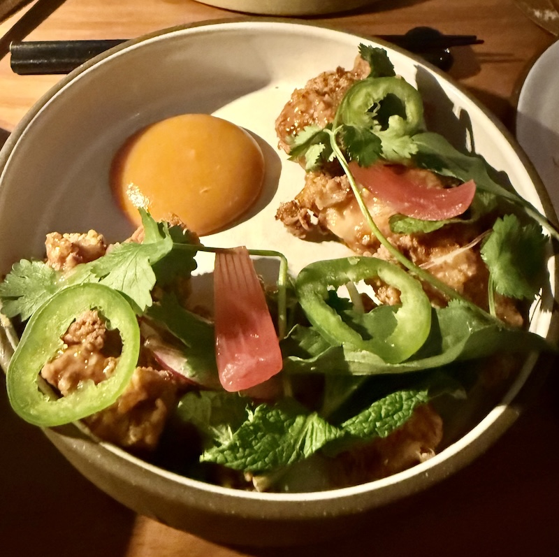Grana Padano, a hard, aged Italian cow’s milk cheese with a granular texture and a nutty, milder profile than Parmigiano Reggiano, adds savor but also softens the kimchi’s brightness. It is not a bad dish, just one I could have skipped amid stronger hits. Like the following favorite, the Fried Chicken: