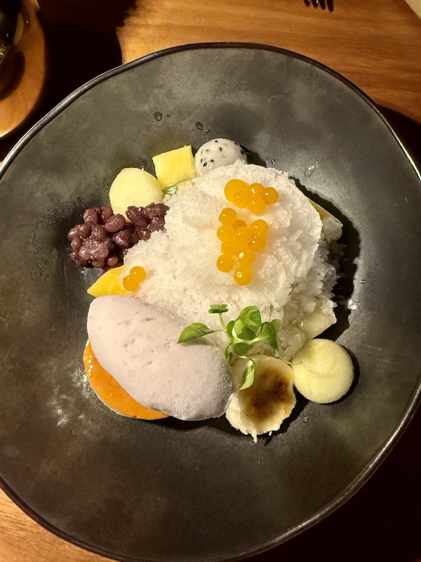 Here, ube ice cream brings a gentle earthiness with vanilla-like warmth that perfumes the whole bowl. The leche flan is dense and glossy, a custard anchor that reads caramel and cream, and feels like an ode to Miami. Tropical fruits add lift and freshness. The kaffir lime milk is genius, turning the usual evaporated milk into something citrusy and aromatic. As you eat, the bite moves from cool and crunchy to creamy and floral, then flashes of tart fruit and caramel from the flan. This dessert is interactive, modern, and very hard to stop eating. Highly recommend, especially if it’s your first opportunity to try!