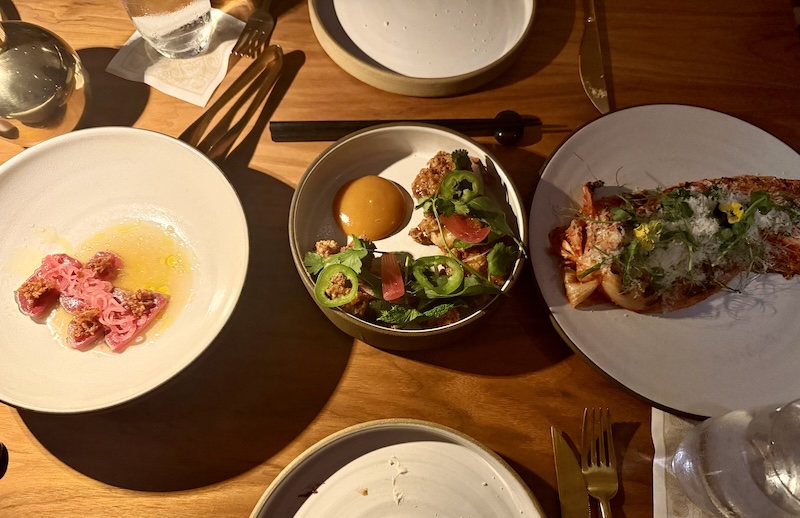 Starting with the appetizers. Pictured below, you have the Tune Crudo on the left, (ignore the middle for now), and the Grilled Broccolini on the right.
